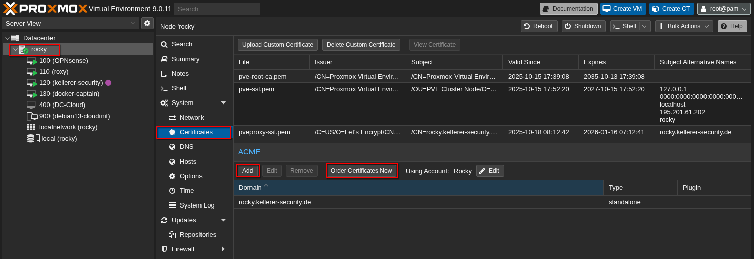Als nächstes wollen wir passende Zertifikate erstellen, sodass im Browser keine Warnung mehr auftaucht, wenn wir unseren Server aufrufen. Das kann ebenfalls komfortabel über das Webinterface von Proxmox erledigt werden.