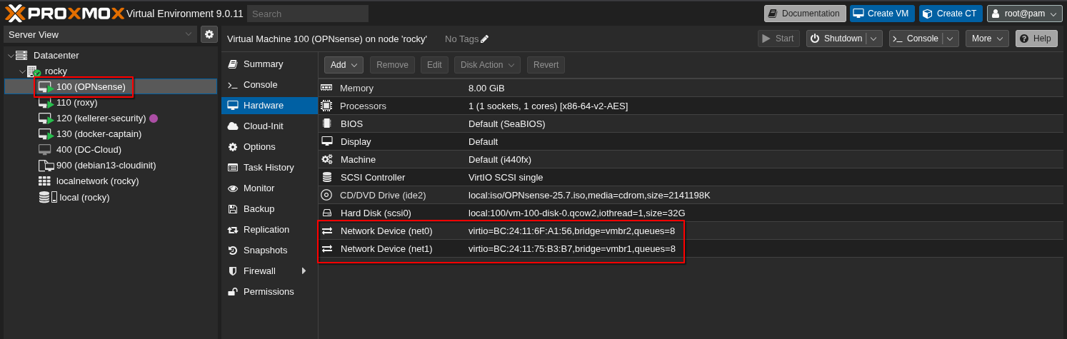 Zunächst konfigurieren wir die OPnsense VM mit zwei Netzwerkinterfaces. Die VM ist somit mit vmbr1 und vmbr2 verbunden.