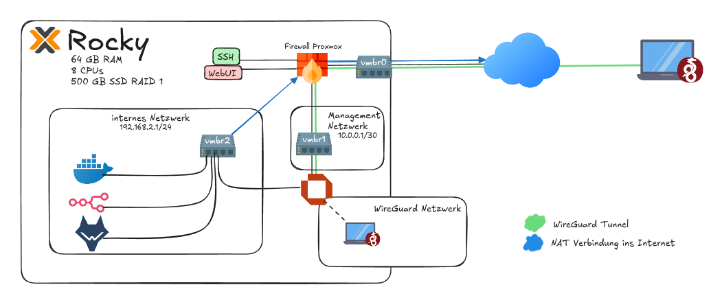 Einrichtung eines dedizierten Cloud-Servers mit Proxmox; Konfiguration eines internen und eines Management-Netzwerks mittels OPNsense Firewall, sowie einer sicheren Verbindung in die Netzwerke mittels Wireguard VPN